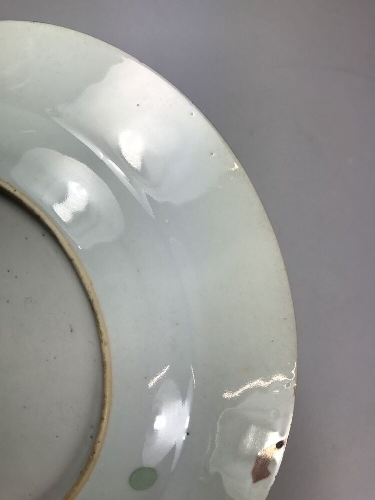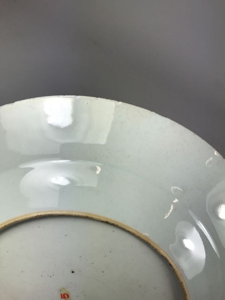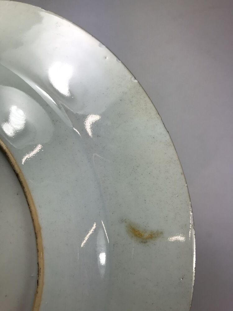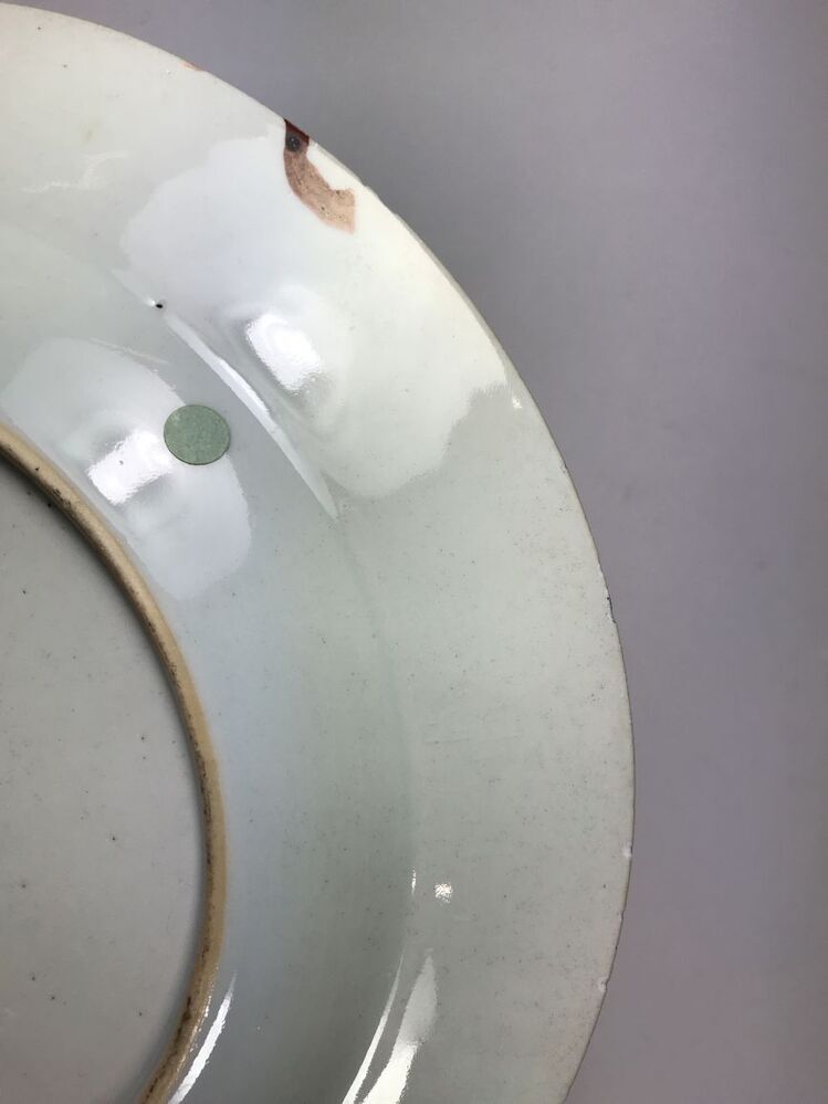 Bord op voetring met spreidende wand en brede platte rand, versierd in diverse emailkleuren. Op het plat is een voorstelling te zien van twee heren en een vrouw in een tuinlandschap. Allen dragen Europese kledij en hebben een westerse haardracht. Links houdt de vrouw haar rok omhoog om appels in op te vangen die een van de heren aan het plukken is van de boom. Rechts van de vrouw zit een jongeman. Op de voorgrond zit een hond. Langs de rand een aaneengeschakeld kettingmotief. Dit bord laat een voorstelling zien die afkomstig is van een Franse prent van Nicolas Ponce (1746-1831) getiteld 'De Appelplukkers'. De prent gaat terug op een schilderij van Antoine Baudoin (1723-1769). In de bestellijsten van de VOC van 1777 werd voor het eerst een bestelling genoemd met de versiering van 'De Appelplukkers'. Dit is een van de weinige Europese versieringen die ook door de VOC besteld is en niet alleen door particulieren. De schepen deden lang over hun reis waardoor de bestelling veel vertraging op liep. (Nederlands)