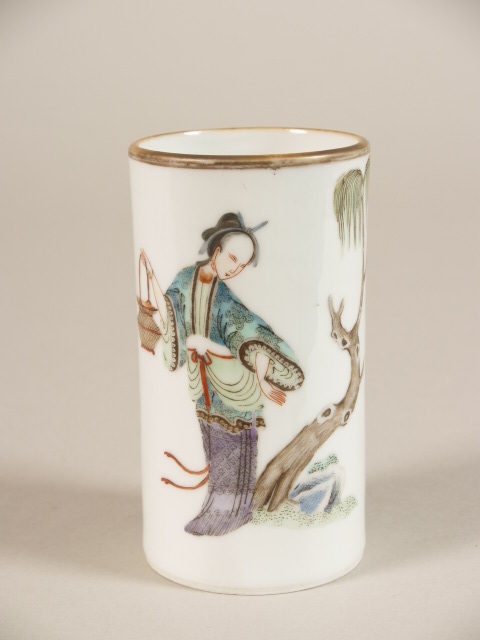 Vaas of penselenpot met decor van vrouwenfiguur, famille rose (Q22784)