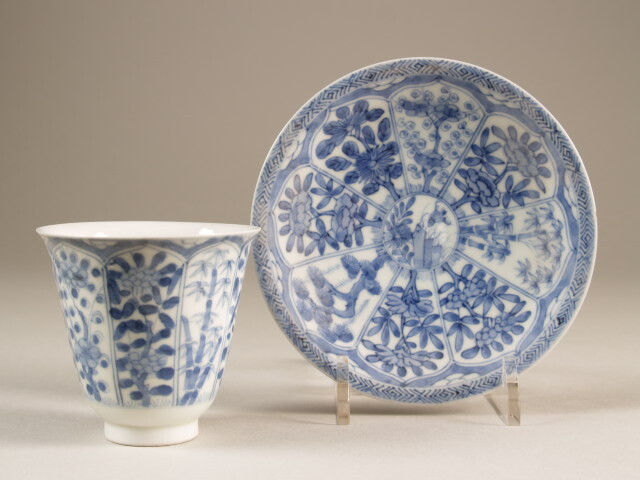 Kop en schotel met decor van vakken waarin bloemranken (Nederlands)