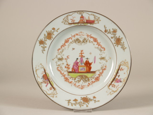 Bord op voetring met spreidende wand en brede platte rand, versierd in diverse emailkleuren en gehoogd in goud. Op het plat een chinoiserie met een heer en een dame zittend aan een altaarachtige tafel met een pot met een koraaltak en een pluim. Het geheel wordt gekaderd door ornamentranden in de stijl van Lodewijk XIV. Op de rand drie medaillons die gevuld zijn met een Chinees interieur binnen eenzelfde ornamentele omkadering. De vakken worden afgewisseld door een bloemtak.De voorstelling is geschilderd in de stijl van Meissen porselein en geeft een ontwerp dat rond 1730 geliefd was. De versieringen zijn geïnspireerd op de decoraties die J.G. Höroldt voor Meissen rond 1720 ontwierp. Hij schilderde zijn eigen chinoiserieën, die de ideeën over de romantiek uit de zeventiende eeuw verbeeldden. Het is niet bekend of het kopiëren van zulke populaire decoraties bedoeld was als directe concurrentie tegen Meissen, of dat het het kopiëren was van de laatste mode uit Europa. In ieder geval is er geen twijfel mogelijk dat de Chinese porseleinschilder in de decoraties niets herkenbaars zag uit zijn eigen cultuur. (Nederlands)