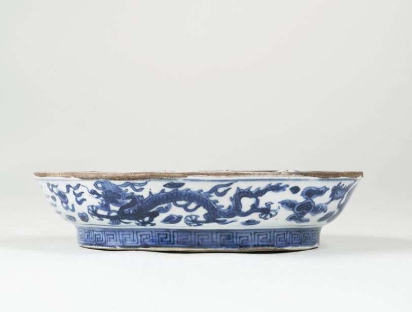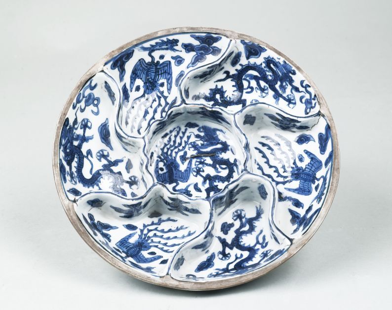 Bak verdeeld in compartimenten en met decor van draken en feniksen (Nederlands)