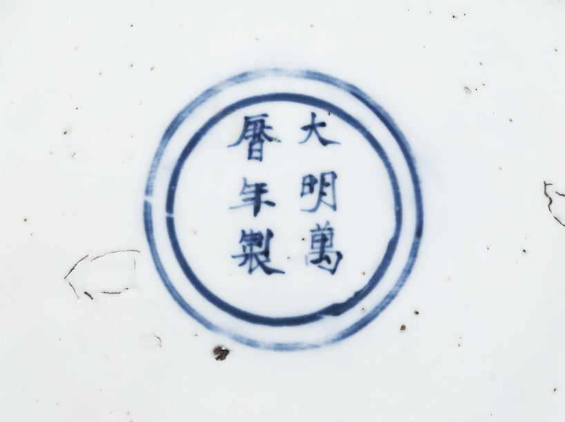 onder op de bodem in kobaltblauw: zesmerk Wan-li in dubbele ring. (Nederlands)