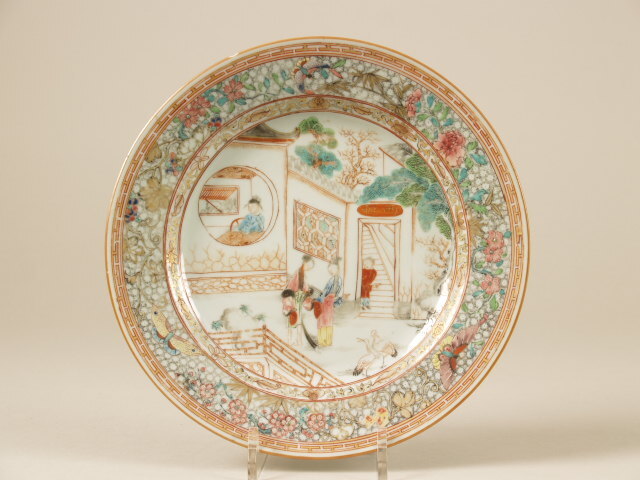 | Nederlands | Bord met decor van figuren in tuin, famille rose |
