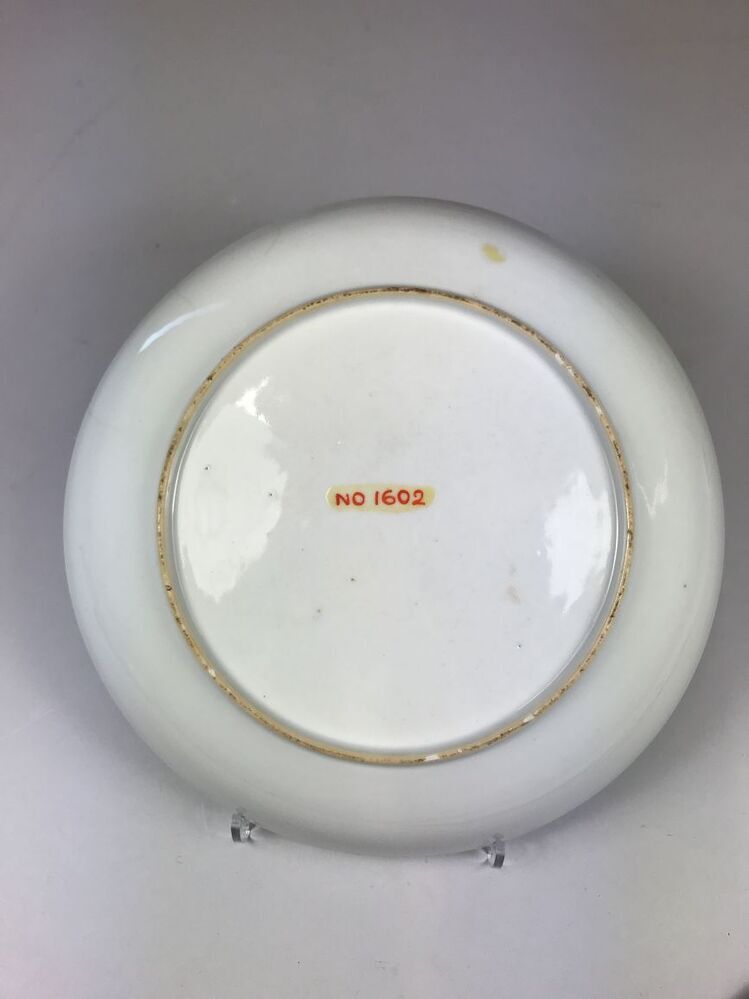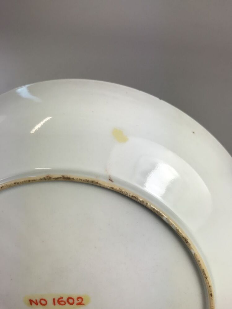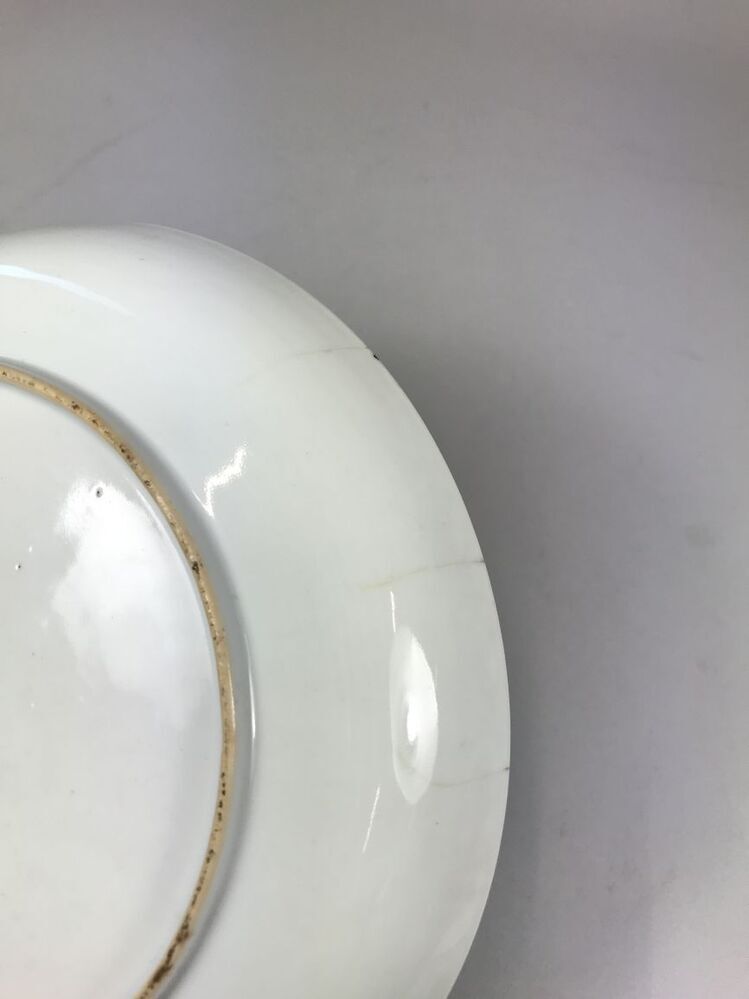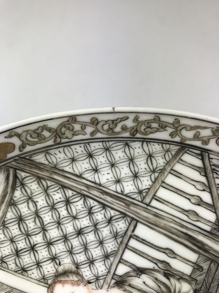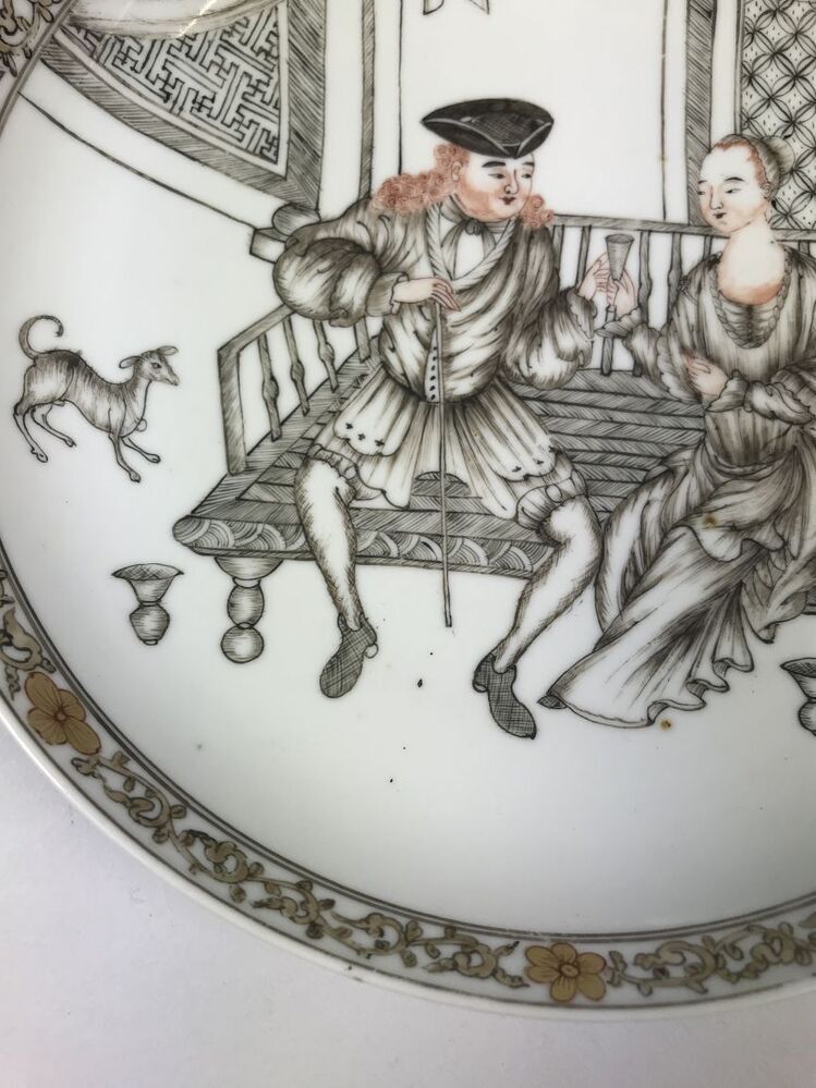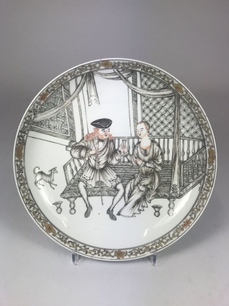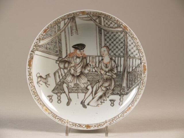 Bord met decor van Europees echtpaar, chine de commande, encre de chine. Bord op voetring met spreidende wand en rechte rand, versierd in encre de chine en met details in ijzerrood en gehoogd in goud. Op het hele plat een voorstelling van een Chinees interieur met een Europese man en vrouw zittend op een bank van Indisch model. Ze hebben beide een kwispedoor bij hun voeten staan. De vrouw reikt de man een fluitglas aan. Links is een hond afgebeeld. Onder de rand een band met krullende ranken, onderbroken door acht bloemen. (Nederlands)