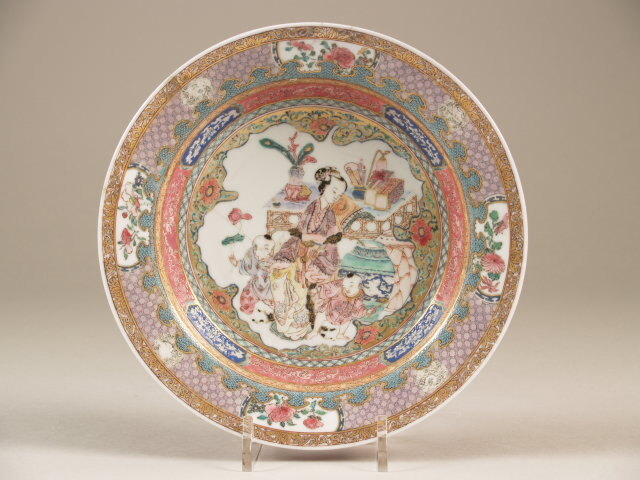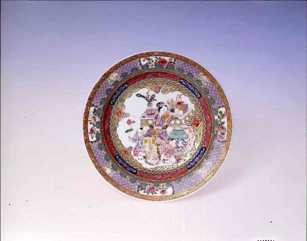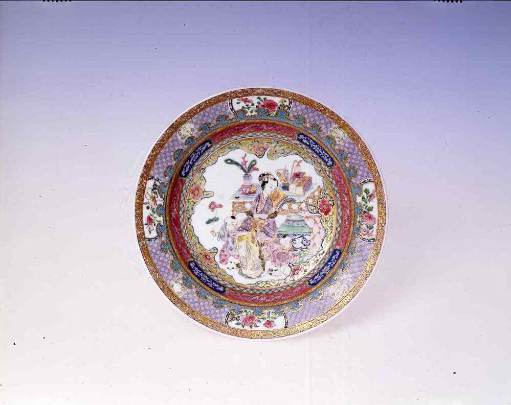 Bord met aan de achterzijde een roze emailkleur. Op de bovenzijde centraal een decoratie van een dame en twee jongetjes temidden van honderd oudheden. Daaromheen zeven ornamentranden. De decoratie is uitgevoerd in famille rose emailkleuren met verguldsel. (Nederlands)
