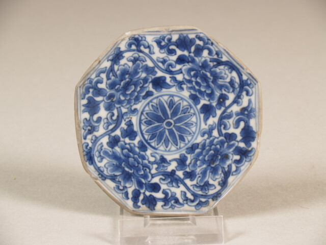| Nederlands | Bodemscherf van achthoekig kom met decor van rozet omgeven door pioenrozen |
