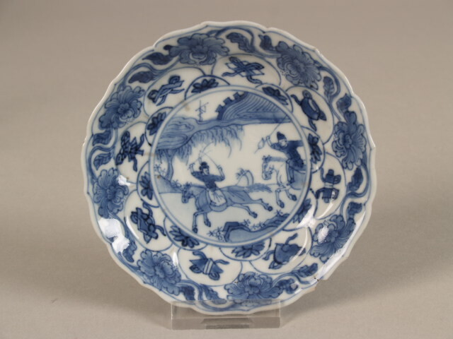 Versiering in kobaltblauw. Plat: landschap met een vesting op de achtergrond. Op de voorgrond twee gewapende ruiters. In de binnenste rij petalen int. telkens een halve rozet, in de buitenste "de acht kostbaarheden". Op de rest van de wand int. 8 bloemen met krullende stengels en bladeren. Wand ext.: in de binnenste petalen een halve rozet, in de buitenste een vruchttak. Op de rest van de wand, die in achten verdeeld is, afwisselend een meerlandschap met een paviljoentje en een zittende figuur in een tuin. (Nederlands)