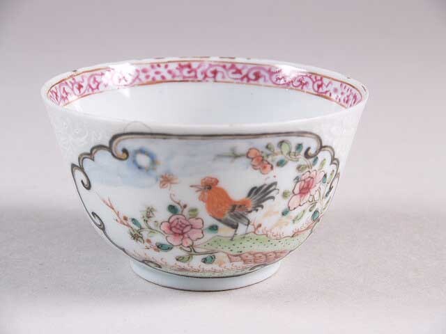 Kop met decor van 2 landschappen met haan tegen wit fond met witte bloemranken, famille rose, encre de chine (Nederlands)