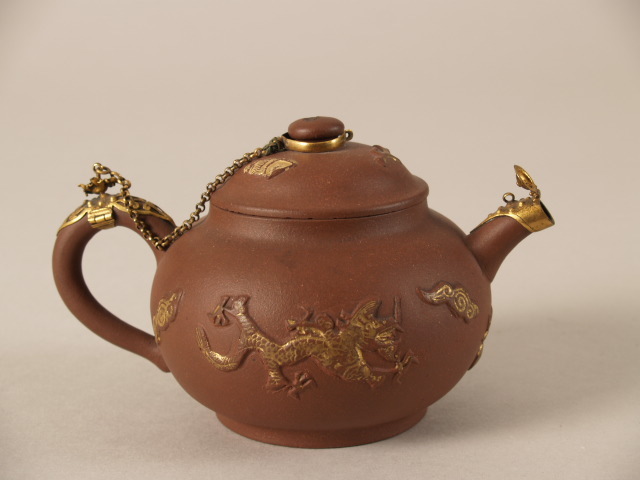 Theepot met decor van draken en metalen montuur (Nederlands)