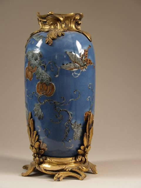 Vaas met montuur, met polychroom decor van bloemen en vruchten in licht reliëf (Nederlands)
