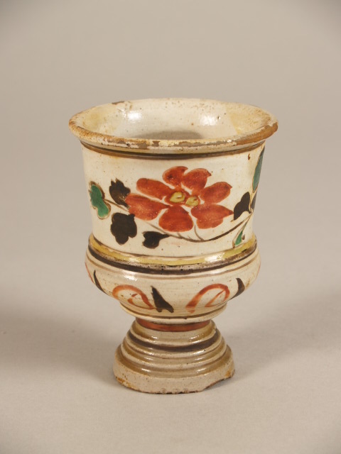 | Nederlands | Beker op voet met decor van bloemranken en biezen |