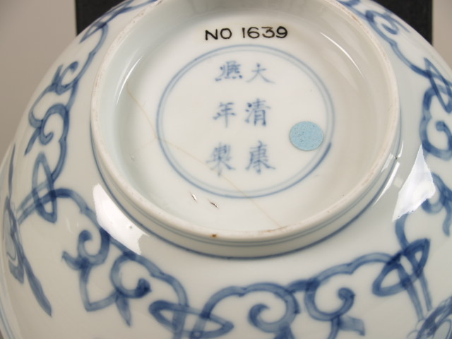op de bodem in kobaltblauw zesmerk Kangxi in dubbele ring (Nederlands)