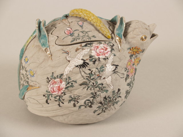 Theepot in de vorm van een kwartel met een decor van planten en kraanvogels (Q22866)