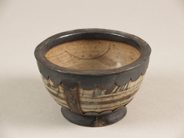 Kom met decor van bruin strepen met zilveren montuur (Nederlands)