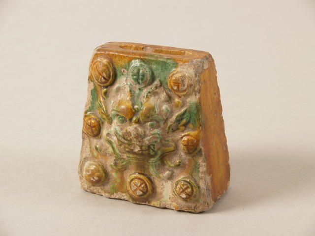 Ornament, vierhoekig, met gleuf en decor van masker en noppen (Nederlands)