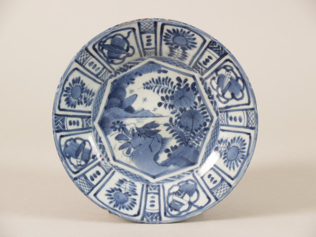 Bord beschilderd in onderglazuur blauw. Op het plat een krekel in een rivierlandschap. Links van de krekel bloeit een bloem en rechts bloeien planten en bloemen. Op de achtergrond zijn heuvels te zien. De wand is verdeeld in acht grote vakken met een bloeiende plant en gelukssymbolen met daartussen kleinere vakken met verschillende motieven en drie stippen. De achterzijde van de wand is verdeeld in vijf brede vakken met een medaillon met een bloem en vijf smalle vakken met een strik. (Nederlands)