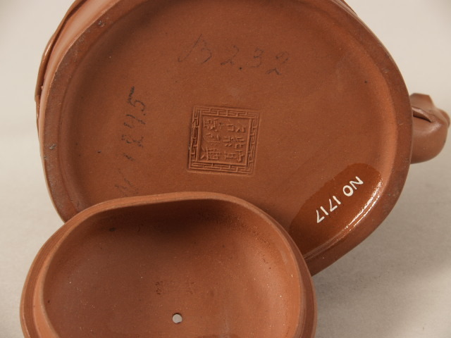 in de bodem ingestempeld zesmerk in een door lei-wên omgrensd vierkant: "Yi-hsing tzû sja (bruine aarde van Yi-hsing)..."(volgt waarschijnlijk de pottebakkersnaam). In het deksel ingestempeld merk. (Nederlands)