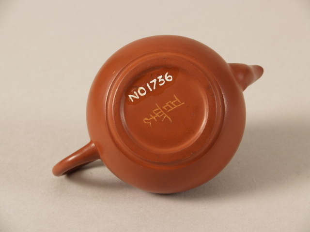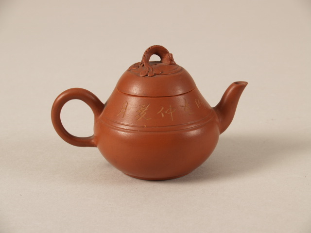 | Nederlands | Theepotje, miniatuur, met decor van karakters en knop in de vorm van een bloeiend takje |