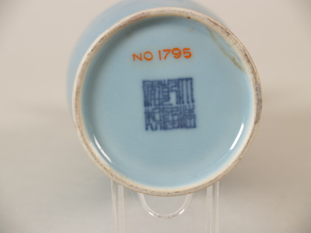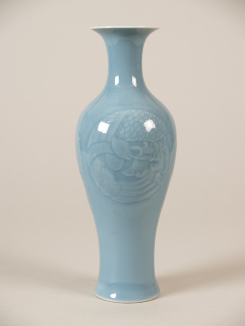 Vaas op een smalle voet die wijder uitloopt naar de buik. De hals loopt wijd uit naar de opening. De vaas is bedekt met een lichtblauwe glazuur. Op de buik bevindt zich aan beide zijden in reliëf een medaillon in de vorm van een feniks. In de achttiende eeuw zijn er veel ontwikkelingen in de porseleinindustrie. Het kleurenpalet voor het decoreren en glazuren van porselein wordt enorm uitgebreid, o.a. door de ontwikkling van pasteltinten. (Nederlands)
