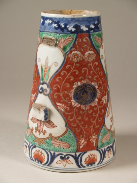 Koffiekan zonder deksel met decor van ranken en bloemen met veel groen bovenglazuur, imari (Nederlands)