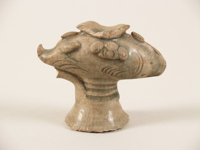 Fles, deel van mond, in de vorm van een vogelkop, celadon (Nederlands)