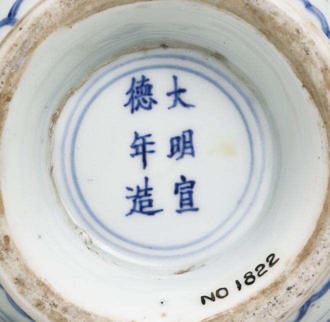 Onderop in kobaltblauw: zesmerk Hsüan Té in dubbele ring. (Nederlands)