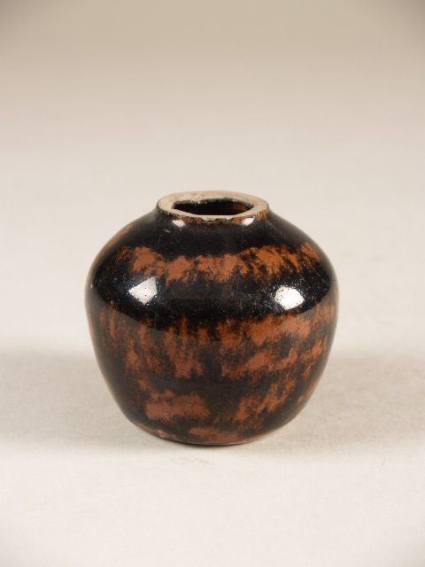 Potje met afgeslepen hals en bedekt met bruin gevlekt glazuur (Nederlands)