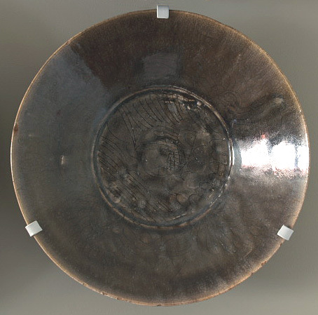 Schotel met een monochroom blauw glazuur en een ingegrift decor van opspringende karper. Zhangzhou ware (voorheen bekend als swatow).||Zhangzhou||Keramiekmuseum Princessehof NO 01841 |