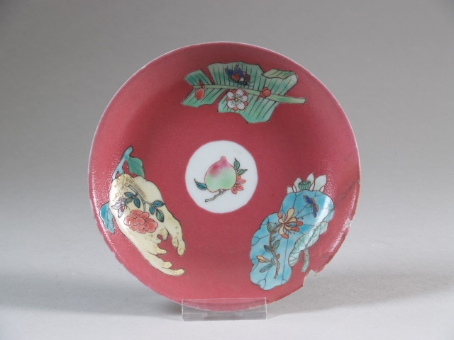 | Nederlands | Schoteltje, fragment, met polychroom decor van bladeren, bloemen en vruchten tegen een roze fond |