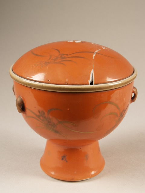 | Nederlands | Pot met deksel en kom met oranje glazuur en verguld decor |