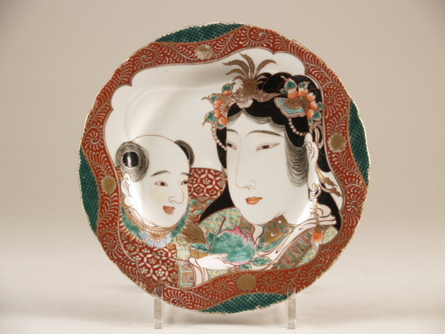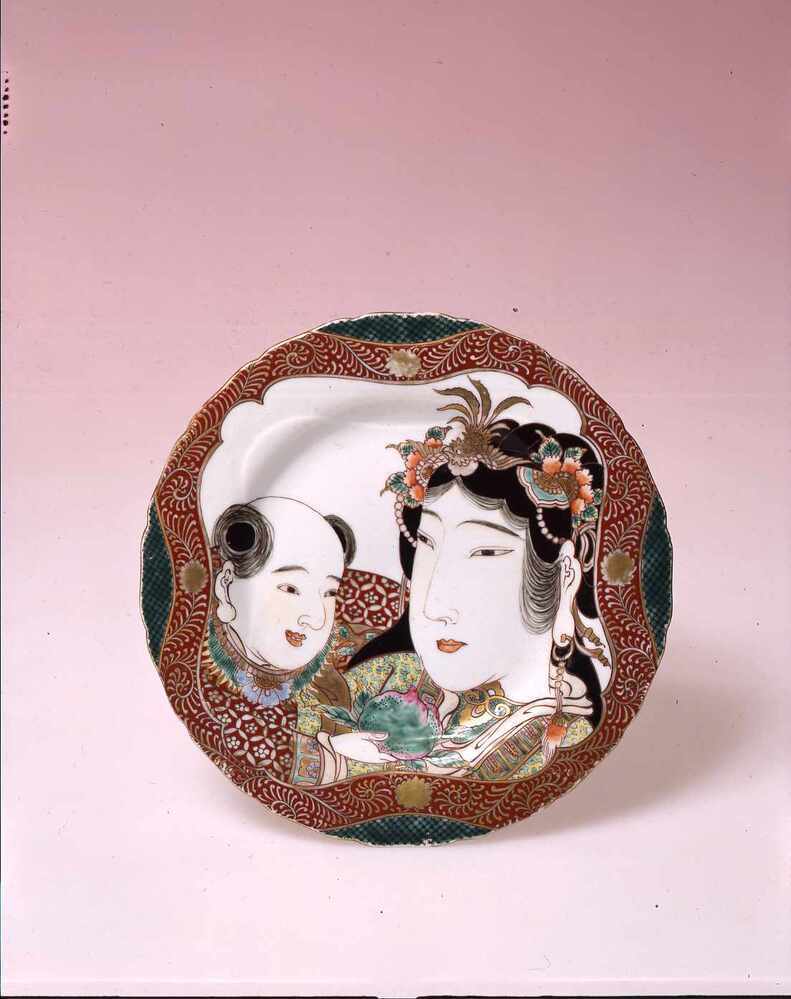 Bord beschilderd op het glazuur in rood, goud, zwart, blauw, groen en roze. Op het plat een voorstelling binnen een kader van het hoofd van een vrouw en een kind die een perzik vasthoudt. Het kader loopt door over de wand en is gedecoreerd met bladranken. Buiten het kader vier vakken met geometrisch motief. Satsuma. (Nederlands)