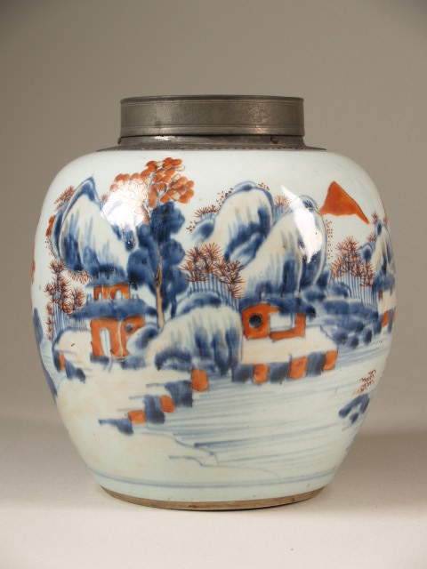Pot met tinnen deksel en polychroom decor van landschap in Chinese imaristijl (Nederlands)