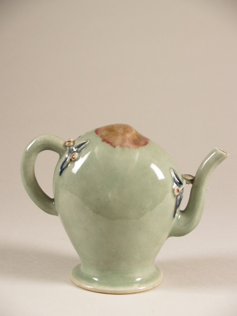 Wijnkan in vorm van perzik met celadonglazuur en blauw en koperrood onderglazuur, cadogan (Nederlands)