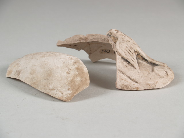 Beeld, in 2 fragmenten, voorstellende een beschermer of grafwachter met vogel (Nederlands)