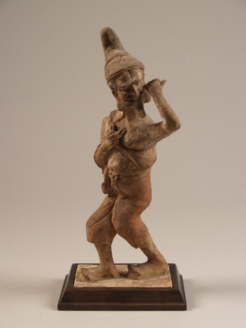 Grafplastiek in de vorm van een niet-Chinese man. In de Tang dynastie werden veel van dit soort grafplastieken vervaardigd in de vorm van buitenlanders, vaak herkenbaar aan een baard, opvallende neus en niet-Chinese kledendracht. De Tang dynastie staat bekend als kosmopolitisch en aan het hof werkte in deze periode mensen uit allerlei landen waar China handel mee dreef. Oorspronkelijk zal deze beeld gedecoreerd zijn geweest in verschillende kleuren, maar door de eeuwen heen zijn deze pigmenten eraf gesleten. (Nederlands)