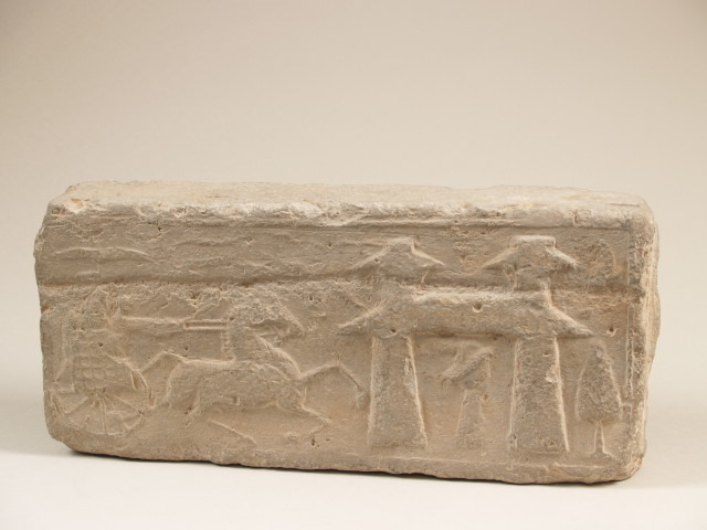 Fragment bouwkeramiek van grijs aardewerk met reliëfdecor van paard, wagen en figuur (Nederlands)