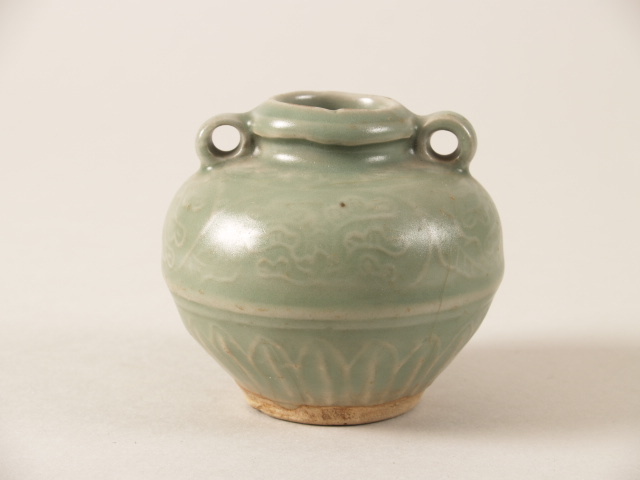 Pot met oren met floraal decor van staande bladmotieven rond de rand (Nederlands)