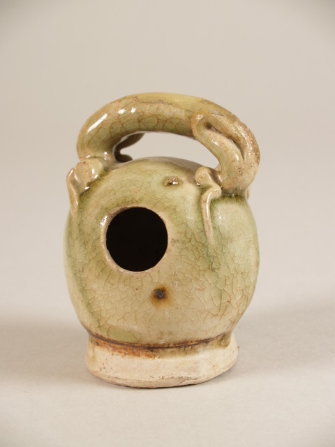 Pot met handvat in de vorm van liaan bedekt met celadon glazuur. Deze potten bevatten kalk, wat een van de ingrediënte...tijd, zoals de Nederlandse Jan Huijghen van Linschoten (1563-1611).||Vietnam||Go-sanh||Keramiekmuseum Princessehof NO 02066