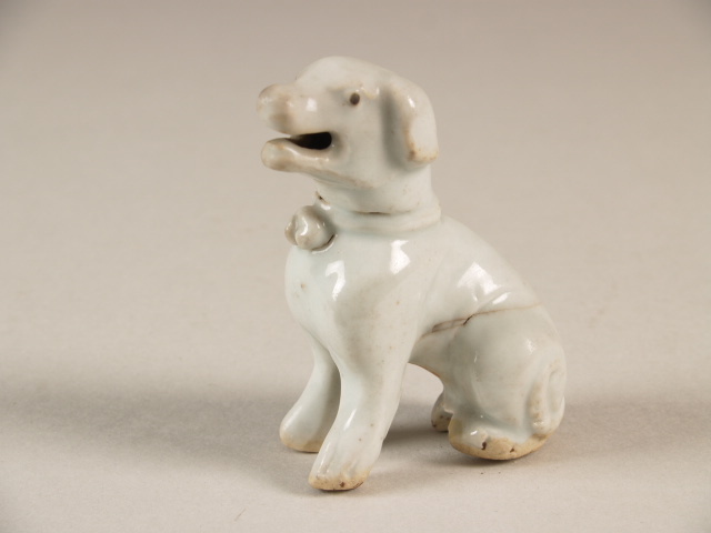 Beeld in de vorm van een zittende hond met halsband, blanc de chine (Q23162)