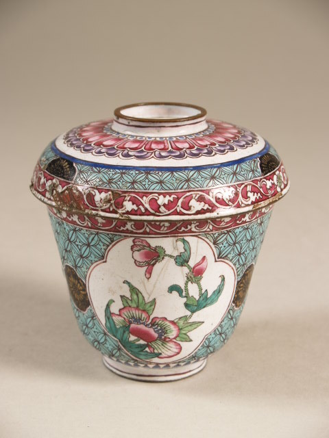 Kop met deksel, wit email op koper, met decor van servetwerk waarin geschulpte uitsparingen met bloemen (Nederlands)