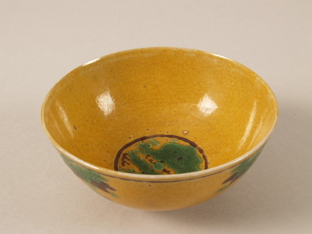 | Nederlands | Kom met in het centrum decor van draak en parel en aan de buitenzijde afhangende vruchtenranken |