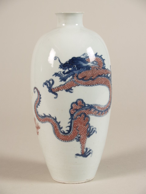| Nederlands | Vaas met decor van 2 draken, onderglazuur koperrood / onderglazuur blauw |