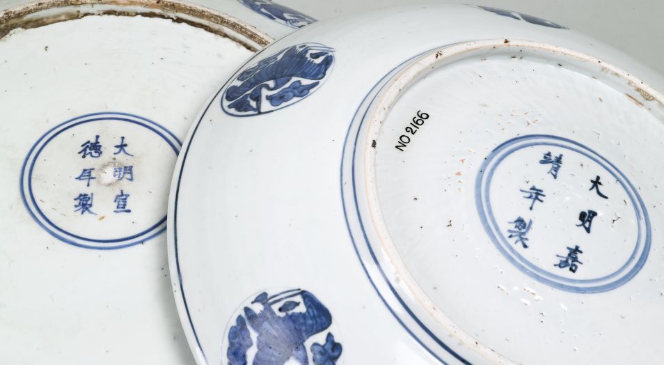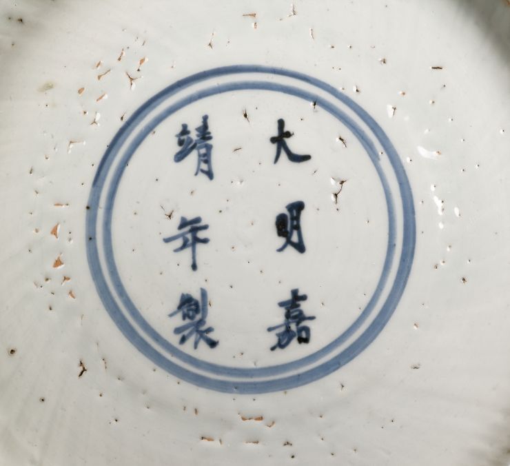 onder op de bodem in kobaltblauw: zesmerk Jiajing in dubbele ring (Nederlands)