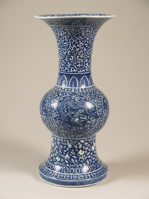 Bekervaas met op de voetring een decoratie van donkerblauwe spiralen op een blauwe ondergrond. Daarboven een band met hangende godrons, een zone met vliegende vogels en perziktakken. Op het bolle deel van de wand van onderen en van boven een rand met godrons. Op de boling rondom vier geschulpte medaillons met elk een draak met vlammen en wolken op een ondergrond van ranken. Op de hals een zone met staand spitswerk, een brede zone met ranken en bloemen. Aan de binnenzijde onder de lip een zone met bloem en bladranken. De decoratie is uitgevoerd in onderglazuur blauw. Het object is Wanli gemerkt. (Nederlands)