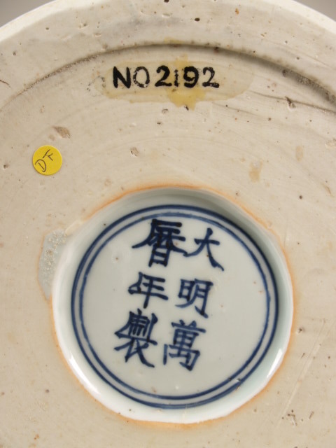 op het middenvlak van de bodem in kobaltblauw onder het glazuur zesmerk Wan-li in dubbele ring. (Nederlands)