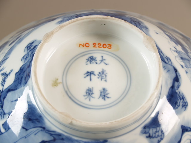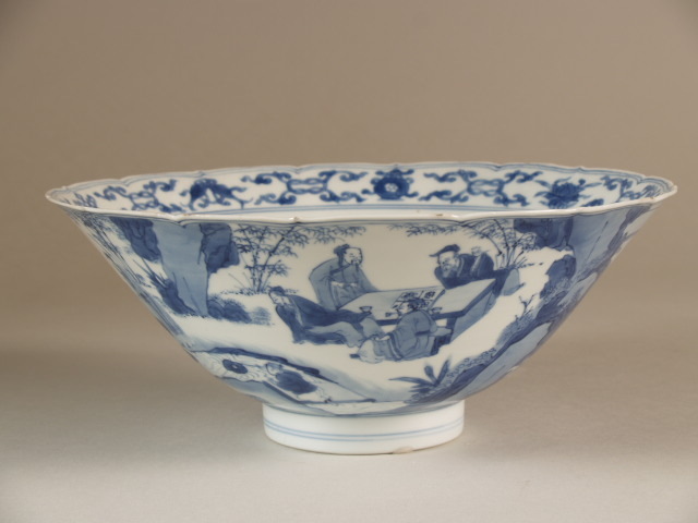 Kom met aan de binnenzijde een centrale voorstelling van een meerlandschap met rotsen, pijnbomen, zon en een kleine figuur. Aan de binnenzijde onder de lip een zone met de acht boeddhistische symbolen, telkens afgewisseld door een geknoopte rank. Aan de buitenzijde een landschap met rotsen, pijnbomen, bamboe en een kleine beek met langs de kant mannen die een theeschenkerij hebben en die de koppen thee op lotusbladeren de beek af laten drijven. Twee jongetjes leiden de bladeren verder met stokjes. De decoratie is uitgevoerd in onderglazuur blauw. Barbara Harrisson beschrijft de scène als volgt: Liu shang qu shi = bekers laten drijven op een kronkelig stroompje. The game of scholars, at leisure. Wine-cups are floated on lotus leaves, while verses are being composed by cup-owners in accordance with rules. Verses have te have some reference to what the last man in line composed and be completed when the cup has reached an agreed section of te waterway. Toelichting over Liu shang qu shi, in dossier van Oostveen, febr. 1983. (Nederlands)