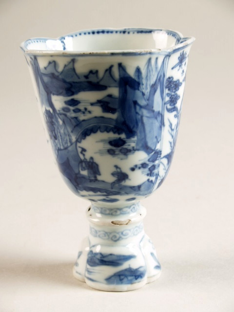 Beker op voet met geschulpte wand en decor van rivierlandschap (Q23215)