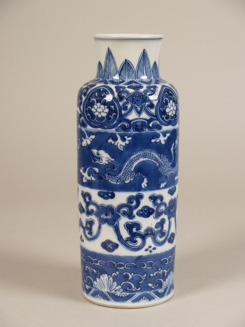 Versiering in kobaltblauw. Op de wand 4 banden, afwisselend blauw en wit, met daarin, van onderen naar boven: een zigzag...punten waartussen symmetrische ranken met bloemen. Op de hals staand spitswerk||China||Keramiekmuseum Princessehof NO 02211