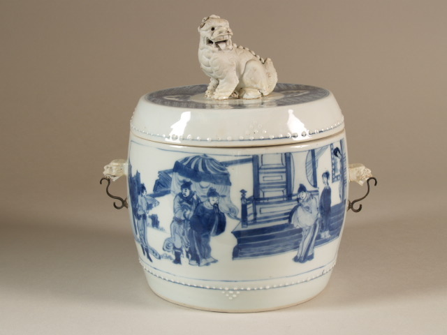 Pot met deksel. De deksel heeft als knop een Fo hond, waarvan de ogen en oren los zaten en beweegbaar waren. Bovenop de deksel een brede geblokte band met vier halve, geschulpte medaillons, elk met een kleine bloeiende plant. Verder om de dekselwand een rand ronde puntjes in relief. Eenzelfde rand langs de onderrand van de pot. Op de wand van de pot verder twee rechthoekige vakken met elk een audientie scene. De decoratie is uitgevoerd in onderglazuur blauw. De pot is gemerkt met een zeskarakter Kangxi merk. (Nederlands)