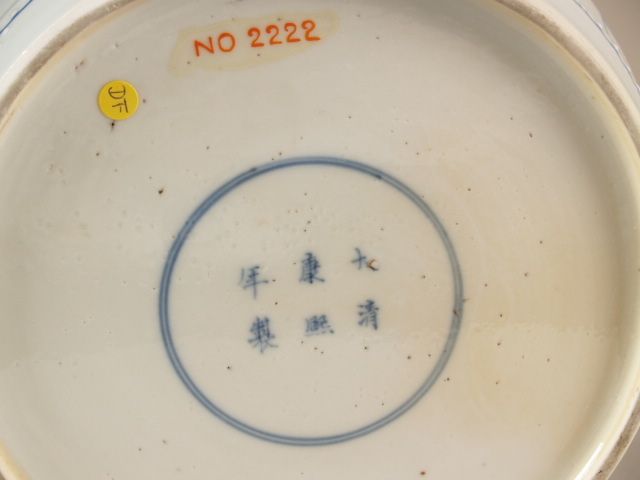 op de bodem in kobaltblauw horizontaal zes karaktermerk Kangxi in dubbele ring. (Nederlands)